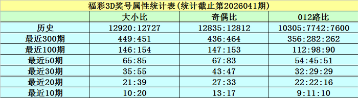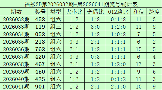 开奖回顾:福彩3D第2026041期奖号为901,其中奖号大小比为1:2,奇偶比为2:1,012路比为2:1:0,和值为10,跨度为9。